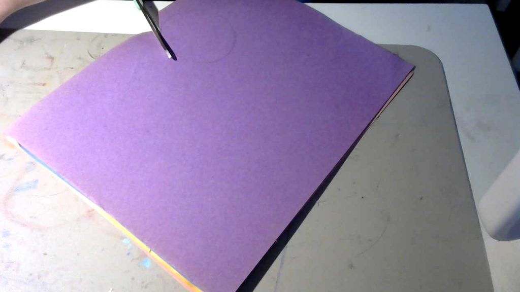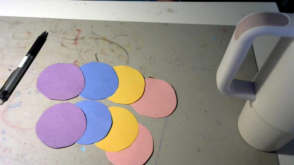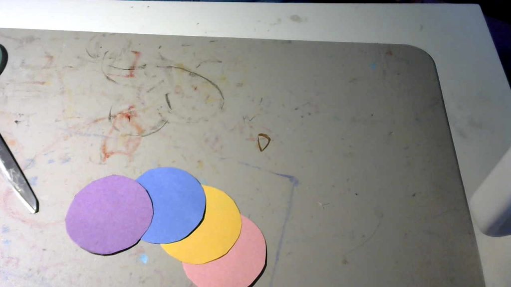 Step #2: Next, stack the pieces of paper on top of each other ( with the one with the circle on top) and cut out the circle. You should have 4 colored circles.